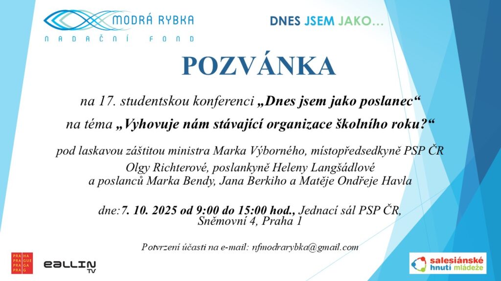 Už zítra se v Poslanecké sněmovně uskuteční 17. ročník studentské konference pořádané Nadačním fondem Modrá rybka na téma: Vyhovuje nám stávající organizace školního roku?“